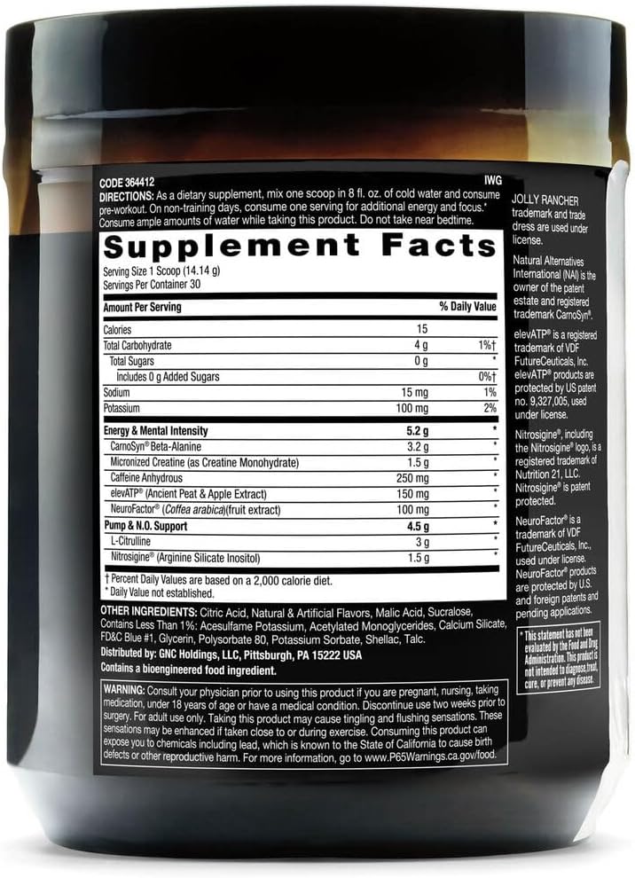 PEAK PERFORMANCE: Contains 1.5g of Nitrosigine, 3g of L-Citrulline, 3g of CarnoSyn Beta-Alanine and 250mg of caffeine per serving to support nitric oxide production, energy, and mental intensity