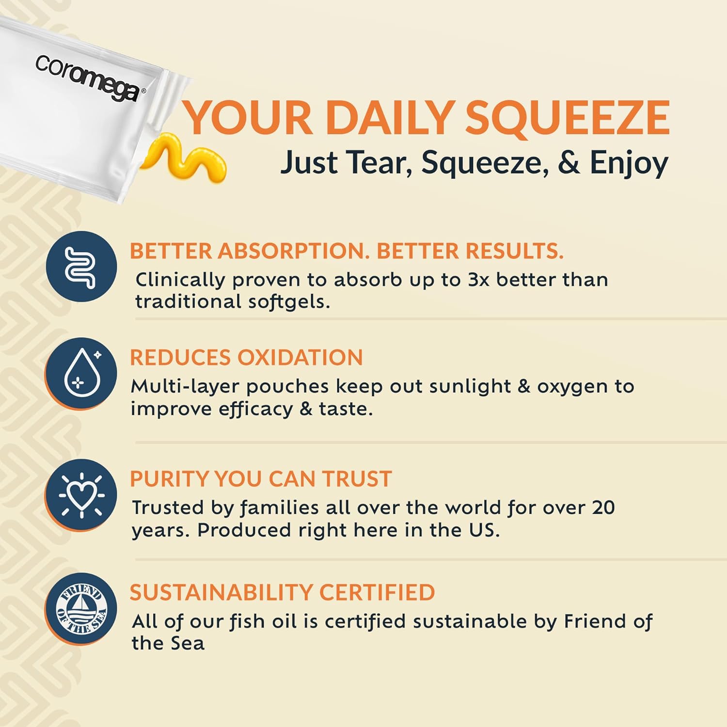 DITCH THE PILLS – Coromega’s squeeze packets couldn’t be easier to take, simply tear off the top and squeeze directly into mouth, onto a spoon, or add to food or drink once daily.