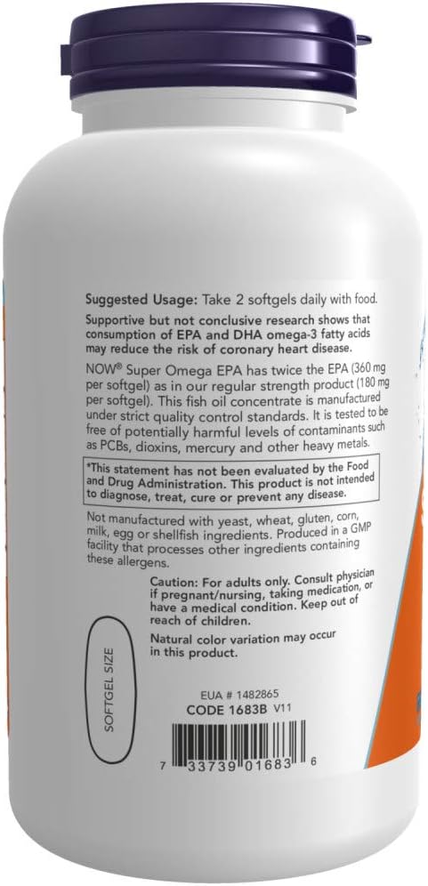 NOW Super Omega EPA has twice the EPA (360 mg per softgel) as in our regular strength product (180 mg per softgel). This natural fish oil concentrate is manufactured under strict quality control standards. It is tested to be free of potentially harmful levels of contaminants such as PCBs, dioxins, mercury and other heavy metals. Take 2 softgels daily with food.