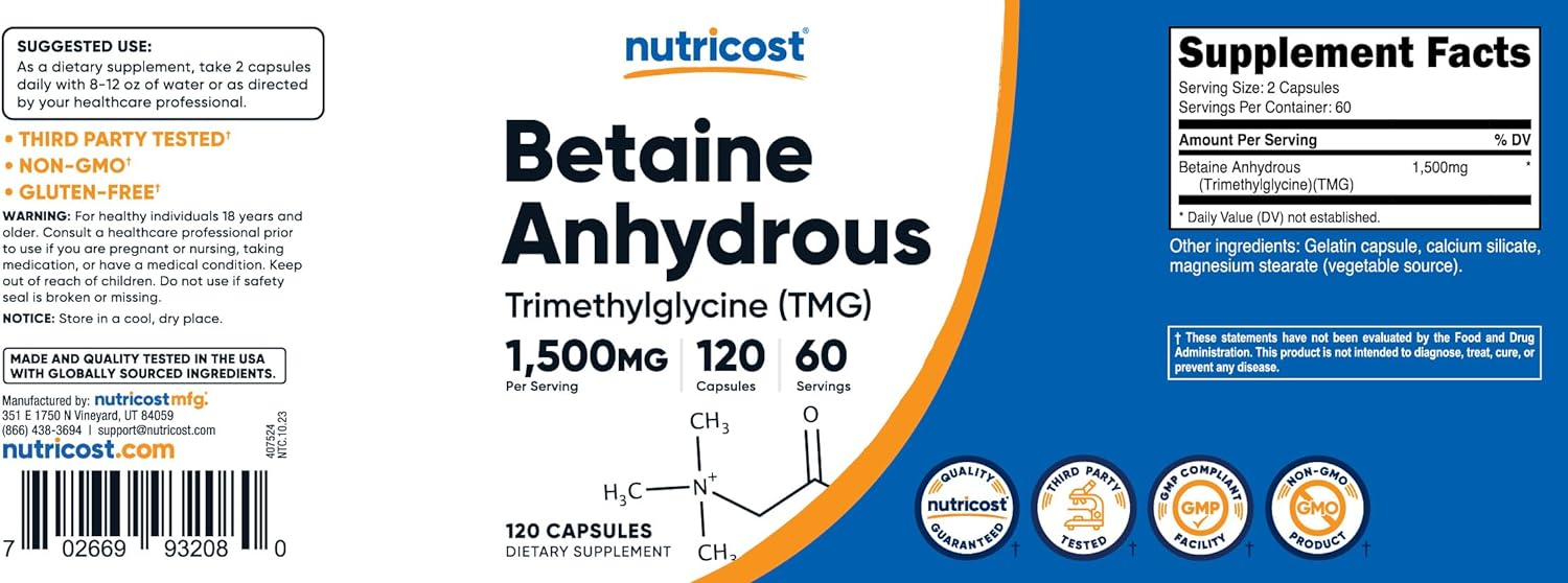Betaine Anhydrous has been shown to be a safe and effective supplement. Nutricost Betaine Anhydrous Capsules contain 750mg of Betaine Anhydrous per Capsule for a 1,500mg serving.